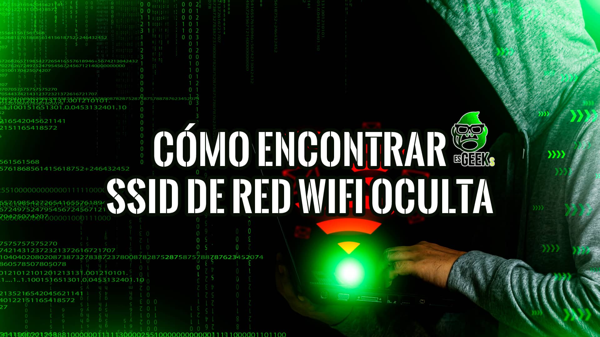 Imagen de una persona usando un ordenador portátil en un entorno oscuro con código binario en el fondo, junto al texto "Cómo encontrar SSID de red WiFi oculta".